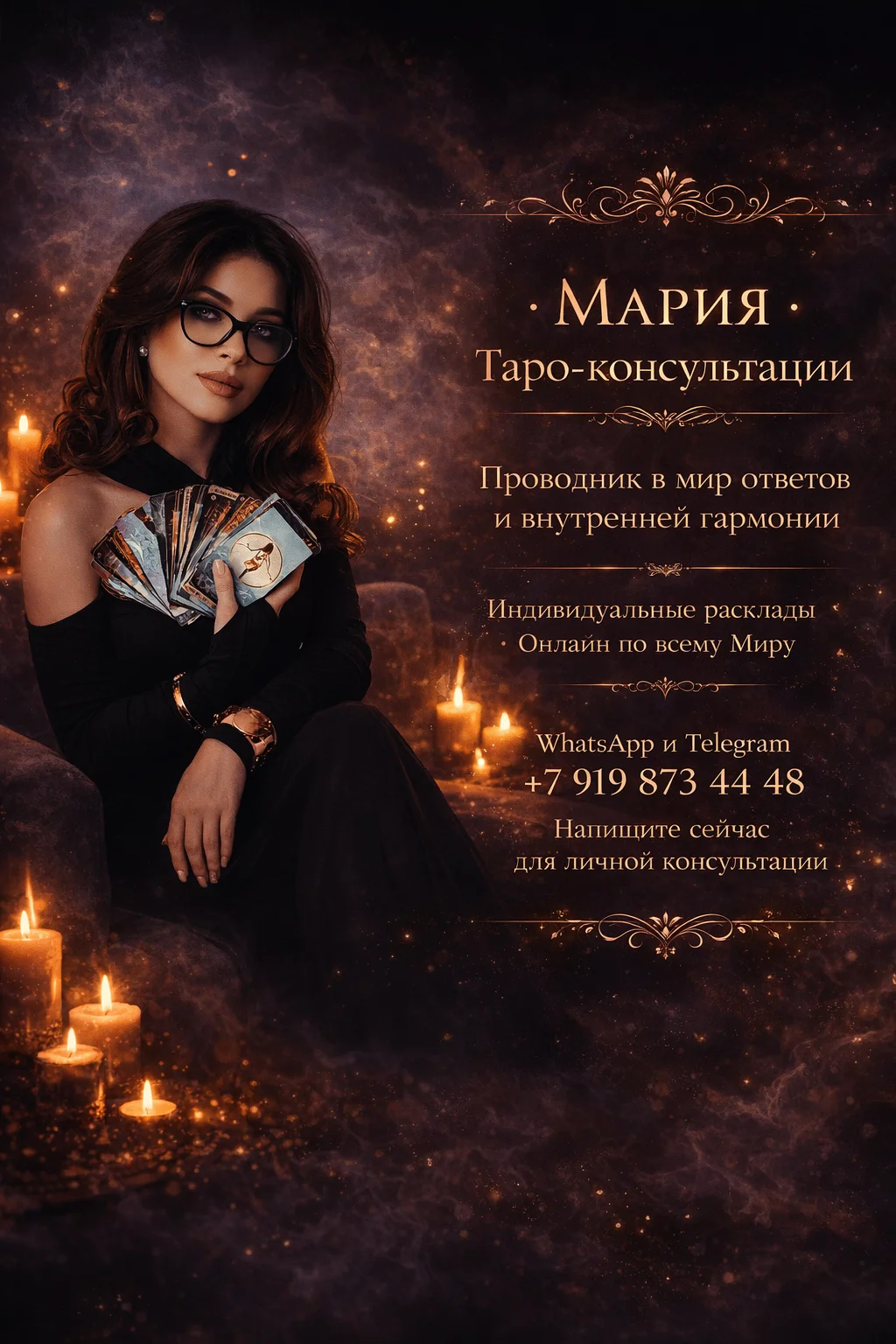 «Моя цель — помочь вам обрести внутреннюю опору. Независимо от того, где вы находитесь — в сердце Москвы или на берегах Босфора — я готова подсветить ваш путь и найти выход из любого лабиринта судьбы».